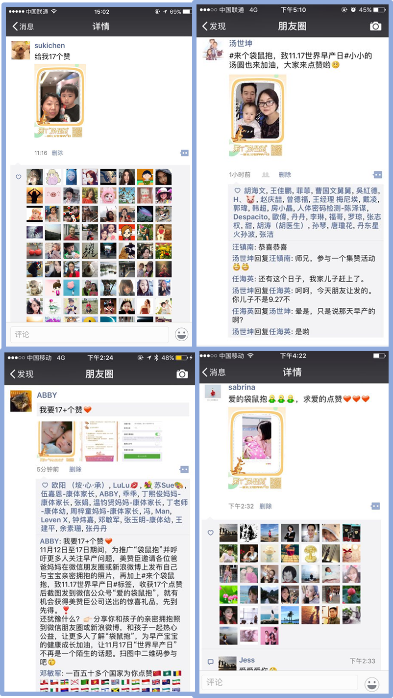 此次“爱的袋鼠抱”亲子照片线上征集活动自11月12日在微信朋友圈和新浪微博一经推出,后台立刻就收到了源源不断的精彩照片,有些妈妈亲身示范“袋鼠抱”,其动作之标准连专业人士也连连点赞;也有早产儿家长骄傲的晒出了自家早产宝宝的照片并分享了自己的心路历程。一位早产孩子的爸爸蔡先生留言:“9年前,我的儿子26周就出生了,体重只有800克,在温箱里住了整整97天;9年后,他上三年级了,语数英在班级里名列前茅,是一个标准的小学霸。我也禁不住为他鼓掌:孩子,你真的很坚强!”。网友们的热情参与吸引了明星的加盟助阵,奥运会和世界杯双料乒乓球冠军马琳和奥运会新一代跳水皇后何姿也在社交媒体上纷纷出镜,呼吁粉丝们为早到的天使加油,向“世界早产日”致敬。