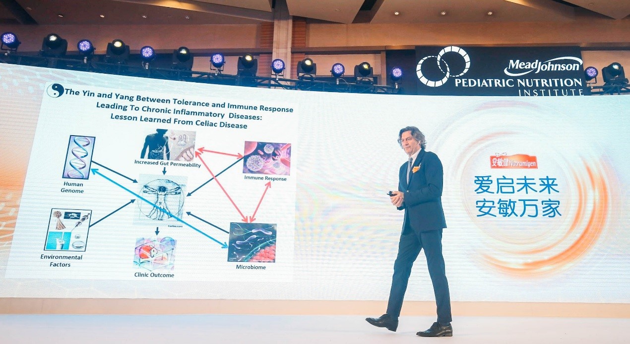 图片说明:哈佛医学院儿科胃肠病学与营养主席Alessio教授演讲中指出婴幼儿牛奶蛋白过敏会引发成年后一系列过敏性疾病。
